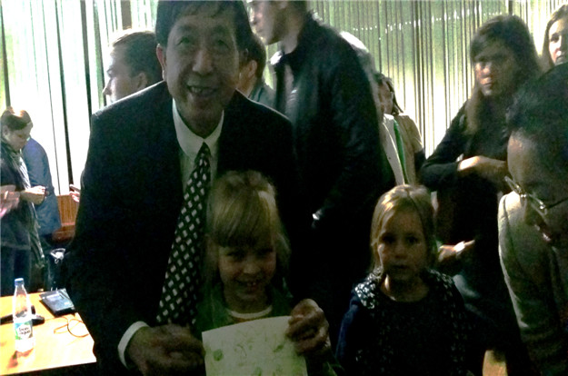長(zhǎng)達(dá)一個(gè)半小時(shí)的講座后,進(jìn)入互動(dòng)環(huán)節(jié),現(xiàn)場(chǎng)的藝術(shù)愛(ài)好者們踴躍發(fā)言,分別提出“中國(guó)畫(huà)有沒(méi)有抽象畫(huà)?”、“中國(guó)畫(huà)好不好學(xué)?”“講座中提到的吳昌碩先生的荷花表達(dá)了怎樣的心境?”、“在中國(guó),‘工筆’與‘寫意’哪個(gè)占主導(dǎo)地位?”等問(wèn)題,樊楓先生均作出了詳細(xì)解答。活動(dòng)結(jié)束后,觀眾紛紛與樊楓先生合影留念并表達(dá)了對(duì)中國(guó)傳統(tǒng)藝術(shù)的喜愛(ài),一名叫索菲亞的小觀眾還特意向樊楓先生贈(zèng)送了兩幅自己的作品,現(xiàn)場(chǎng)氣氛十分友好活躍。
