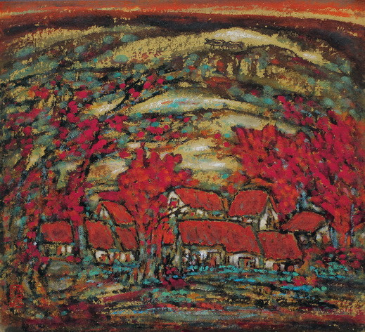 ??? 每當(dāng)我踏上峰戀疊嶂、溪河縱橫的鄂西山區(qū),常常被粗獷而質(zhì)樸、古老而神秘的氛圍所籠罩,亦為世代生息于斯的土家族山民的生活及巴楚文化所吸引。我愛(ài)土家山民吹著那古樸的銅喇叭,它在土家人的嘴上吹奏出令人醉心的痛苦和歡樂(lè),也愛(ài)土家男女老少如醉如癡地跳著那優(yōu)美的巴山舞,還有那恬靜的山野、清香的苞谷地,山一樣的牛、云一般的羊、清而純的清江水……這種質(zhì)樸的生活、質(zhì)樸的情、質(zhì)樸的美格外吸引我、打動(dòng)我。我愛(ài)山里人的誠(chéng)摯樸素,喜歡與山民交朋友。從八十年代起我便以地處鄂西山區(qū)的長(zhǎng)陽(yáng)土家為創(chuàng)作生活的基地,每年都習(xí)慣要去那里寫(xiě)生或看看山村的變化。堅(jiān)實(shí)神秘的紅土,凝聚著世間的無(wú)窮生命、無(wú)限力量。土家人對(duì)于生命、對(duì)生與死有著自已獨(dú)特的思索和表達(dá)方式。以哭嫁和跳喪為例,哭嫁是女子婚嫁的一種告別儀式,哭嫁歌是一種長(zhǎng)詩(shī)結(jié)構(gòu)和抒情悲歌,是樂(lè)極之悲,以歌當(dāng)哭,盡情宣泄。跳喪是老人謝世后,哀家舉行的一種吊喪儀式,人們?cè)谝环N悲壯的氣氛中擊鼓而歌,踏地而舞,通宵達(dá)旦,近于迷狂??藜夼c跳喪是對(duì)人生悲歡激情的大宣泄,是對(duì)生與死得一種精神上的解脫。我在《紅土系列》創(chuàng)作“跳喪”的畫(huà)中,將擊鼓和跳舞者以古樸、簡(jiǎn)潔、渾厚的整體造型以及富于裝飾、充滿張力的構(gòu)圖,在黃色粗質(zhì)的土紙上以紅黃黑三色為基調(diào),紅黑交輝、藍(lán)綠相映,原始的意味、跳躍的激情,使畫(huà)面呈現(xiàn)強(qiáng)烈而深沉、浪漫而神秘的氣氛。