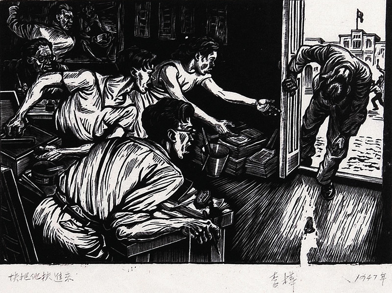 抗戰(zhàn)結束后,李樺離開軍隊來到上海,加入到爭取民主和反對內戰(zhàn)的運動中。早在部隊時李樺便對國民黨黨內的腐敗極度不滿,所以在這一時期他創(chuàng)作出大量富有斗爭性的作品去進行批判。如《怒潮》組畫、《糧丁去后》、《里外同心》、《快把他扶進來》、《都市的暗角》等等作品,此時的李樺正處于一生藝術創(chuàng)作生涯中的巔峰時期,《怒潮》組畫不但是他個人的代表性作品,后來更成為反內戰(zhàn)時期的經典作品。組畫的前三幅《掙扎》、《抓丁》、《抗糧》分別表現(xiàn)的是“怒潮”的起因,最后一幀的《起來》則表現(xiàn)的是“怒潮”的爆發(fā)。盡管作者沒有去創(chuàng)作“怒潮”的結局,但藝術作品的誕生總是聯(lián)系著時代,所以結局也早已不言自明。在整組作品中,李樺極力突出畫中人物形象的表現(xiàn)力度,再加上他此時的創(chuàng)作情感始終處于一種飽滿、燃燒的狀態(tài),所以塑造的人物極具動感和張力,仿佛要破框而出,緊扣觀者的心弦。畫面表現(xiàn)了社會底層人民力量的強大,并以悲壯、崇高的美學風格震撼著人心。李樺對社會有著獨立的判斷意識,用自己的藝術創(chuàng)作鞭笞著當時的社會現(xiàn)狀。他身上堅貞不屈的抗爭精神與探尋民族苦難根源的執(zhí)著,使得他的作品充滿了精神的感召力,更在藝術的深度上給人留下無限的遐想。