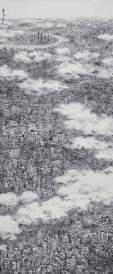 熟悉樊楓的人都知道,近幾年樊楓對于都市文化的視覺探求已經(jīng)越來越引起學界的關注。探尋樊楓的視覺表達行跡,不難發(fā)現(xiàn),早在上個世紀1994年他即以《第八號橋墩》(紙本水墨,137cm*204cm,1994)而開始自我對于都市文化進程中的社會發(fā)展情態(tài)進行視覺思考,至1999年,他的《綠色家園》(紙本水墨,144cm*204cm,1999)不僅令樊楓聲名鵲起,其時,樊楓自我風格化講述已初露端倪,城市空間的亦真亦幻,似有似無,若隱若現(xiàn)。老武漢的人情味兒、精氣神兒和火爆勁兒及一條條承載著武漢市民命運的橋梁、街道、里弄、高樓……樹木、磚瓦……他以一種既真切又親切,既熟悉又新奇的水墨表達,和有距離的審視,把一個視覺知識分子對武漢城市變化的真誠思考、激情表達出來。此后,經(jīng)過數(shù)十年經(jīng)年累月的積累和探索,約在2009年至2011年間,樊楓有如神助般取得了很大突破,給閱讀者印象深刻的有《歐來歐去》系列,(2010時間段居多),《都市味象》系列和《俯城》系列。