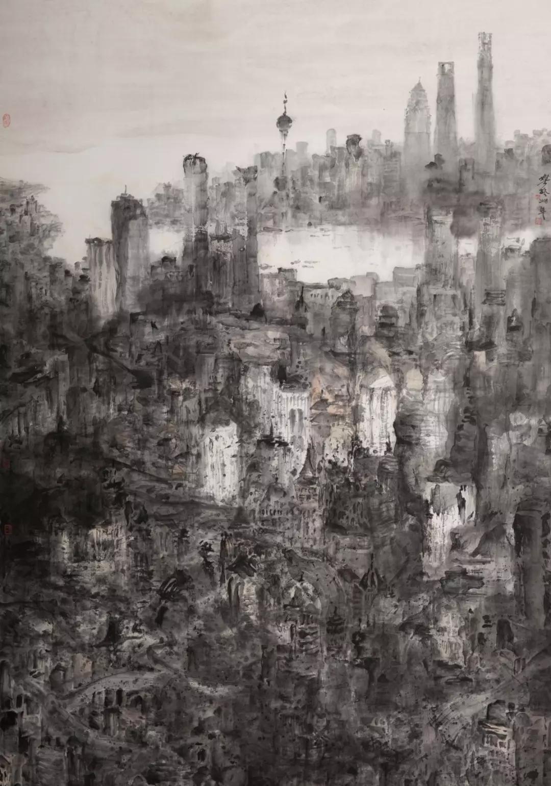 樊楓從8月份開始創(chuàng)作,歷時一月就完成了。之所以創(chuàng)作得如此順利是基于樊楓幾十年來對都市水墨的持續(xù)創(chuàng)作和探索。