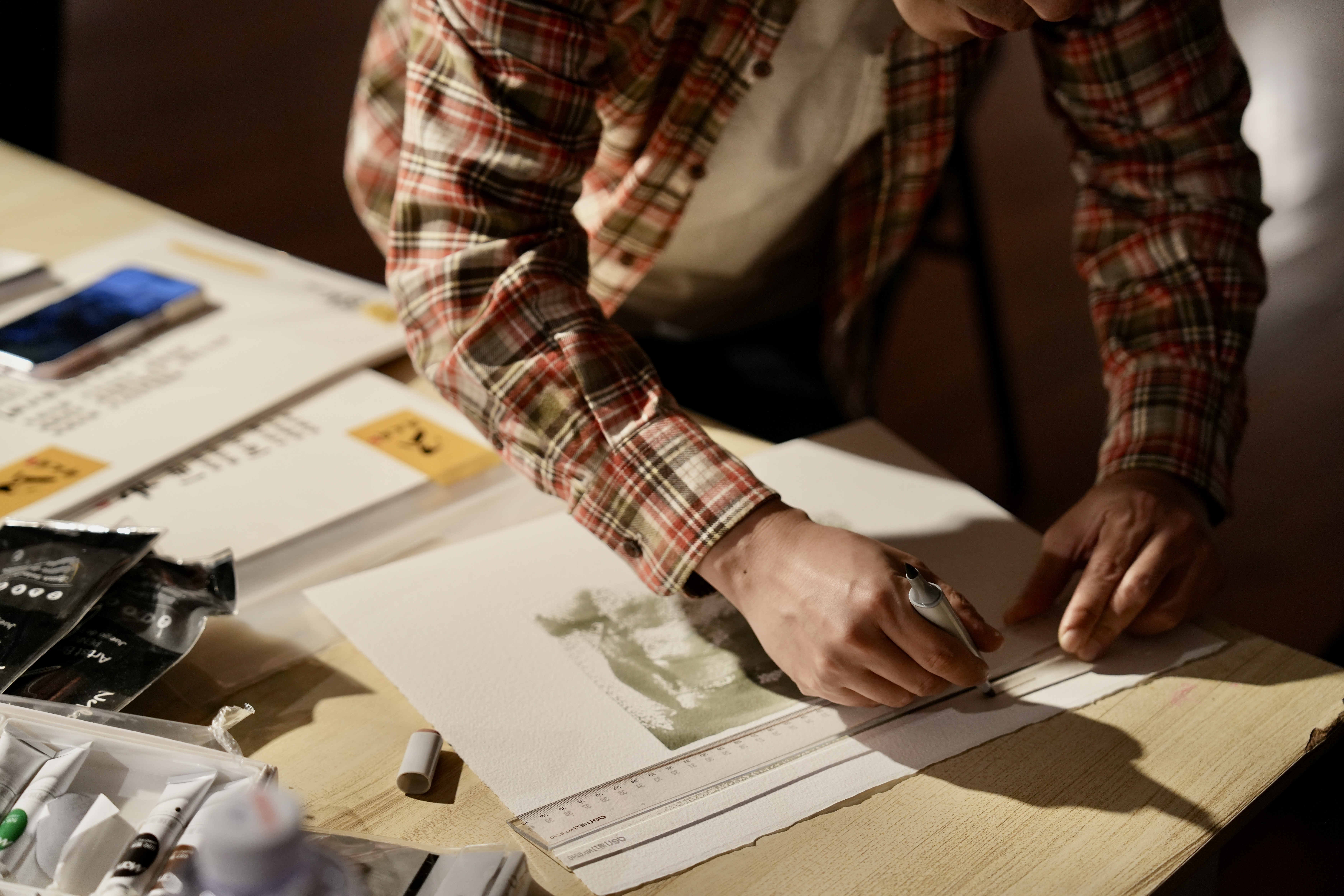 “千言萬語不如動手示范”,了解劉壽祥先生對“術(shù)”的研究后,鄧涵教授以示范教學(xué)的方式,帶領(lǐng)學(xué)生們探索水彩材料的特性。