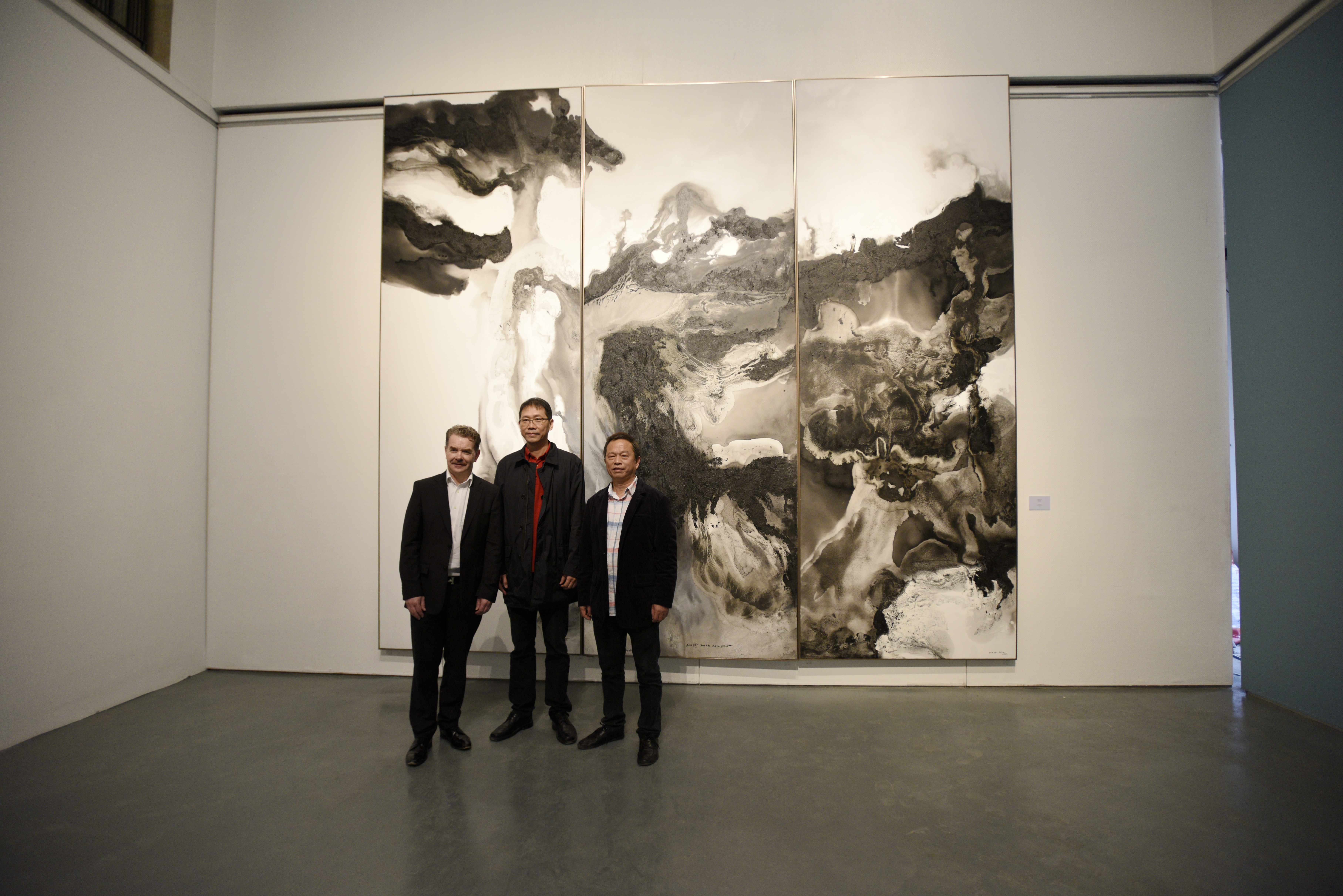 ? 凱榮·歐·凱恩校長(zhǎng)、武漢美術(shù)館副館長(zhǎng)劉宇、藝術(shù)家王心耀在《中國(guó)風(fēng)》作品前合影