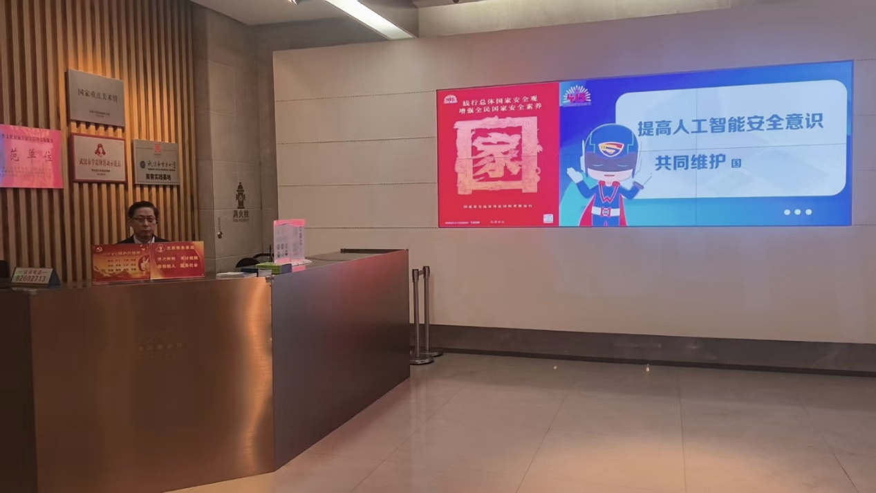 館方充分發(fā)揮藝術(shù)場館的傳播優(yōu)勢,在(漢口館)、(琴臺館)同步實施"閃屏行動",從4月1日開始,通過12塊電子大屏滾動播放國家安全主題標(biāo)語及普法短視頻。