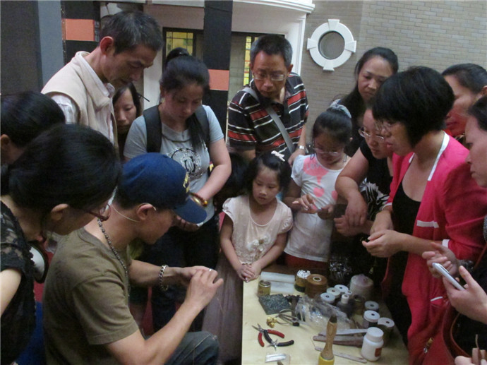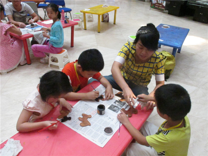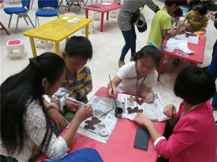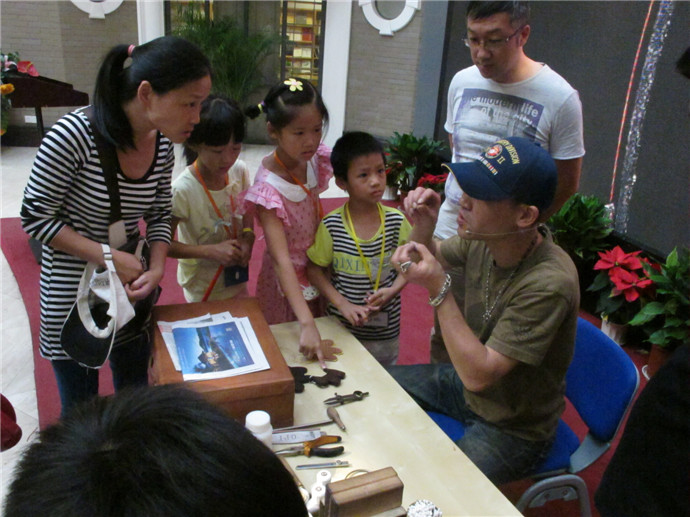 10月7日下午2點(diǎn),魯老師準(zhǔn)時來到了美術(shù)館,這次他還請來了周老師為小朋友們共同講解和示范手工皮藝的制作工藝.印制日期,染色,涂膠,粘合,縫線,小朋友們親自動手,一個個獨(dú)具特色的小馬鑰匙扣就這樣誕生了.