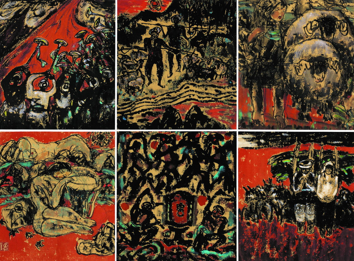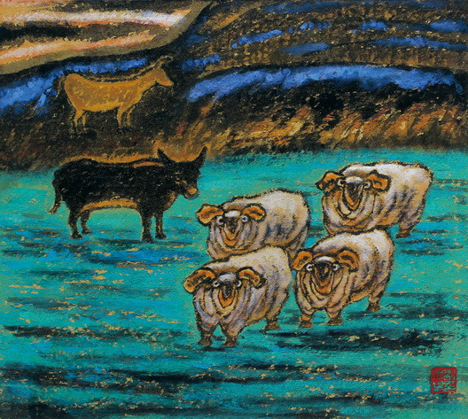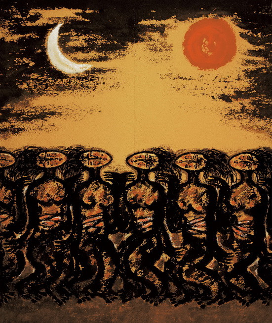 ??? 每當(dāng)我踏上峰戀疊嶂、溪河縱橫的鄂西山區(qū),常常被粗獷而質(zhì)樸、古老而神秘的氛圍所籠罩,亦為世代生息于斯的土家族山民的生活及巴楚文化所吸引。我愛(ài)土家山民吹著那古樸的銅喇叭,它在土家人的嘴上吹奏出令人醉心的痛苦和歡樂(lè),也愛(ài)土家男女老少如醉如癡地跳著那優(yōu)美的巴山舞,還有那恬靜的山野、清香的苞谷地,山一樣的牛、云一般的羊、清而純的清江水……這種質(zhì)樸的生活、質(zhì)樸的情、質(zhì)樸的美格外吸引我、打動(dòng)我。我愛(ài)山里人的誠(chéng)摯樸素,喜歡與山民交朋友。從八十年代起我便以地處鄂西山區(qū)的長(zhǎng)陽(yáng)土家為創(chuàng)作生活的基地,每年都習(xí)慣要去那里寫(xiě)生或看看山村的變化。堅(jiān)實(shí)神秘的紅土,凝聚著世間的無(wú)窮生命、無(wú)限力量。土家人對(duì)于生命、對(duì)生與死有著自已獨(dú)特的思索和表達(dá)方式。以哭嫁和跳喪為例,哭嫁是女子婚嫁的一種告別儀式,哭嫁歌是一種長(zhǎng)詩(shī)結(jié)構(gòu)和抒情悲歌,是樂(lè)極之悲,以歌當(dāng)哭,盡情宣泄。跳喪是老人謝世后,哀家舉行的一種吊喪儀式,人們?cè)谝环N悲壯的氣氛中擊鼓而歌,踏地而舞,通宵達(dá)旦,近于迷狂??藜夼c跳喪是對(duì)人生悲歡激情的大宣泄,是對(duì)生與死得一種精神上的解脫。我在《紅土系列》創(chuàng)作“跳喪”的畫(huà)中,將擊鼓和跳舞者以古樸、簡(jiǎn)潔、渾厚的整體造型以及富于裝飾、充滿張力的構(gòu)圖,在黃色粗質(zhì)的土紙上以紅黃黑三色為基調(diào),紅黑交輝、藍(lán)綠相映,原始的意味、跳躍的激情,使畫(huà)面呈現(xiàn)強(qiáng)烈而深沉、浪漫而神秘的氣氛。
