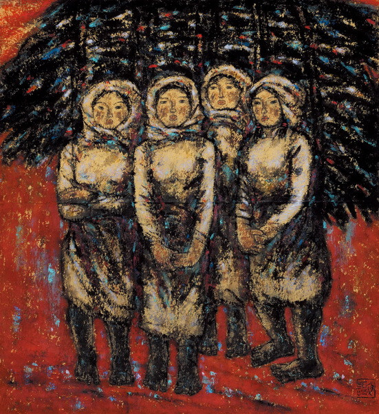 ??? 運(yùn)用手工土紙作畫(huà),是在長(zhǎng)陽(yáng)山區(qū)寫(xiě)生時(shí),就地取材買(mǎi)下土紙?jiān)囉?,不意產(chǎn)生獨(dú)特的效果,后來(lái)我在當(dāng)?shù)貙iT(mén)加工定制這種手工土紙作畫(huà)。由于土紙和宣紙的性能完全不同,土紙的質(zhì)地粗松、浸水性能較差,既不宜發(fā)揮水墨的細(xì)膩效果,也不宜表現(xiàn)筆觸的豐富姿態(tài),但它適宜表現(xiàn)那粗渾枯澀的紅土質(zhì)地和山民那粗獷質(zhì)樸的性格,它還適宜追求墨、色、線、塊的寫(xiě)意重彩效果,可反復(fù)多層次的涂寫(xiě),把握渾厚的造型、整體的氛圍和強(qiáng)烈的色彩,使畫(huà)面顯得古樸、厚重。這了適應(yīng)這種土紙的特性,我吸取楚漆、漢畫(huà)和古代壁畫(huà)等我國(guó)古代和民間的藝術(shù)特點(diǎn),同時(shí)借鑒西方藝術(shù)經(jīng)驗(yàn),努力尋求、探索自已的藝術(shù)語(yǔ)言。
