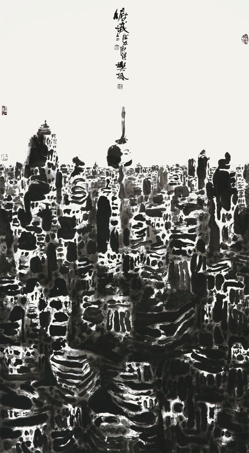 透過樊楓的視覺水墨敘事,閱讀者看到了文化的轉(zhuǎn)型、文明的變遷,社會的進步所帶來的生活方式和藝術方式的變化。樊楓以自我的努力和不間斷勇氣,不僅深刻地揭示出了這種變化,更以一種當代的表達確立了自我個性化的都市文化標識。由此閱讀者亦發(fā)現(xiàn),雖然樊楓學藝甚早,轉(zhuǎn)益多師,真正找尋到自我的觀念與方法約在1994年。此為其第一變也;第二次重要突破則是在1999年,其間歷經(jīng)5年,從1999年至2010年則是樊楓藝術贏得贊譽和認同的重要時間段。近十年的耕耘,樊楓以擅于思考,勤于變化,而且精于表達,終成氣象,此后樊楓則進入隨心所欲不逾矩的游刃有余之境界。期間,樊楓不僅逐漸去掉具象形象和多余素材,其實他走的是一條刪繁就簡的藝術之路,視覺圖景中的繁簡與疏密的變化,黑白的分明與純凈,墨色由濃到淡的微妙,由重到輕的急緩,讓閱讀者看到了一個在都市文化關懷中既有著一種自覺,更有著一種自信表達的樊楓。