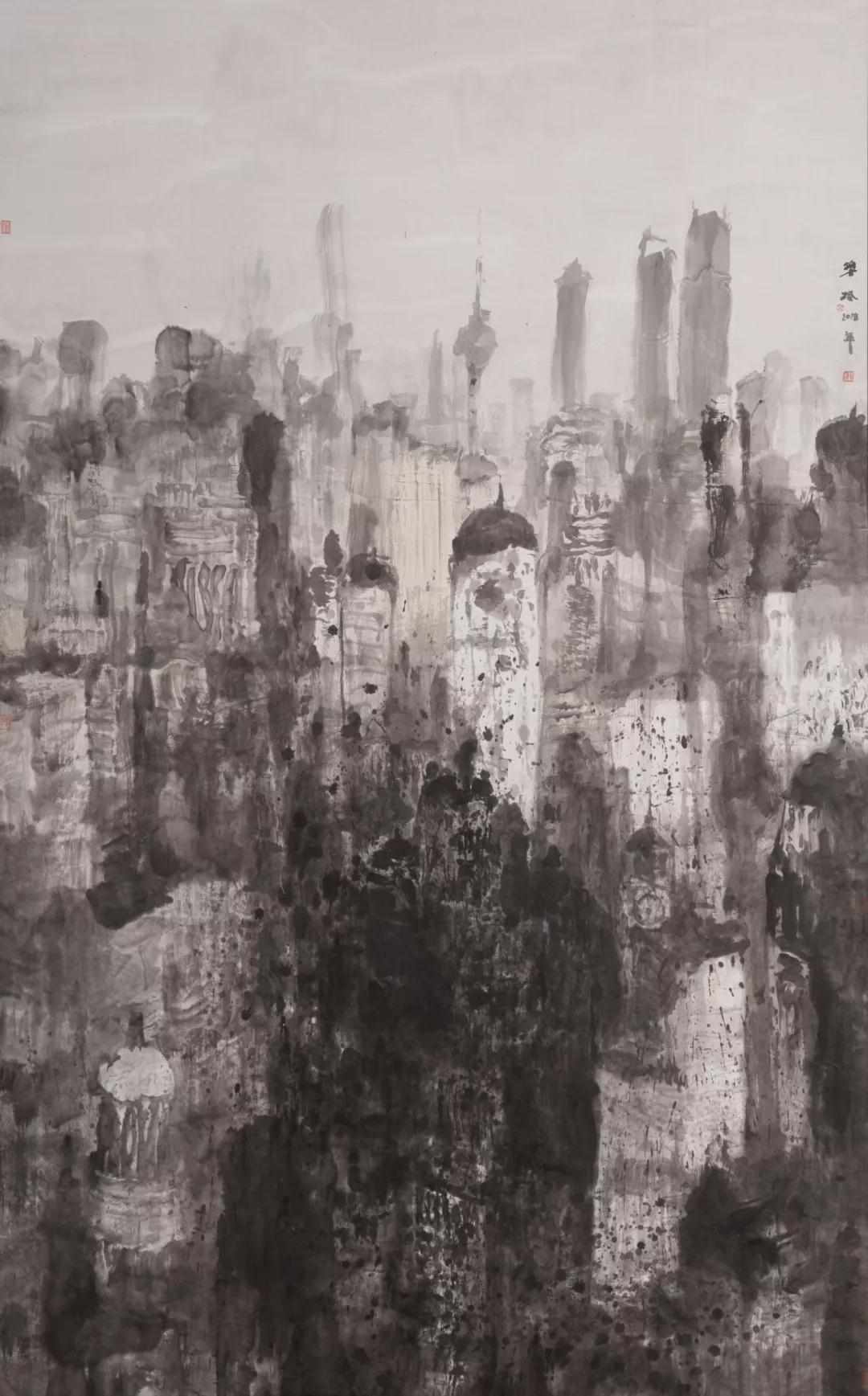 樊楓從8月份開始創(chuàng)作,歷時一月就完成了。之所以創(chuàng)作得如此順利是基于樊楓幾十年來對都市水墨的持續(xù)創(chuàng)作和探索。