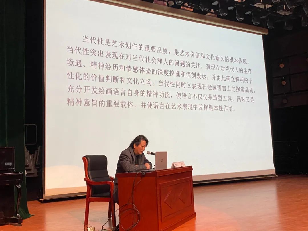 其中,張江舟先生以“語(yǔ)言與精神的內(nèi)在邏輯”為核心,講解了中國(guó)畫(huà)的當(dāng)代性思考。他指出,當(dāng)代性是藝術(shù)創(chuàng)作的重要品質(zhì),是藝術(shù)價(jià)值和文化意義的根本體現(xiàn);當(dāng)代性突出表現(xiàn)在對(duì)當(dāng)代社會(huì)和人的問(wèn)題的關(guān)注,表現(xiàn)在對(duì)當(dāng)代人的生存境遇、精神經(jīng)歷和情感體驗(yàn)的深度挖掘和深刻表達(dá),并由此確立鮮明的價(jià)值判斷和文化立場(chǎng);當(dāng)代性同時(shí)又表現(xiàn)在繪畫(huà)語(yǔ)言上的探索品質(zhì),充分開(kāi)發(fā)繪畫(huà)語(yǔ)言自身的精神功能,使語(yǔ)言不僅僅是造型工具,同時(shí)又是精神意旨的重要載體,并使語(yǔ)言在藝術(shù)表現(xiàn)中發(fā)揮根本性作用。